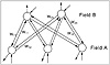 The neural network for a fuzzy associative memory has an input and an output layer, with full connections in both directions, just as in a BAM neural network. Figure 9.1 shows the layout. To avoid cluttering, the figure shows the network with three neurons in field A and two neurons in field B, and only some of the connection weights. The general case is analogous.